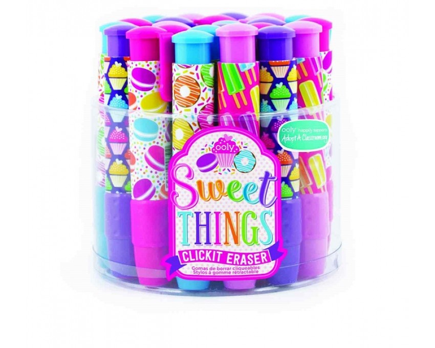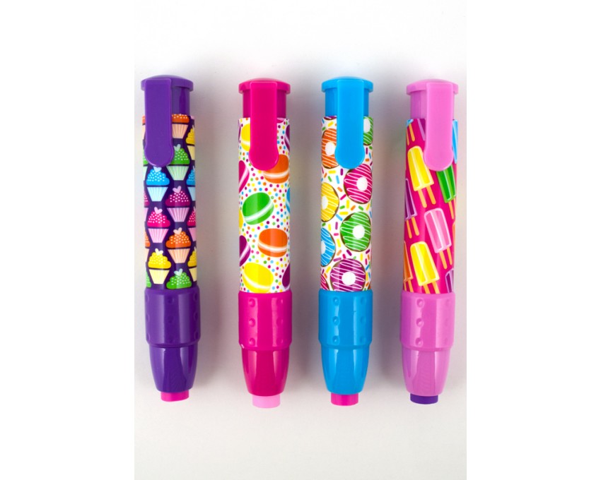 Gumki do ścierania ze słodkim akcentem. Co może być bardziej słodkiego niż lizaki, ciasteczka, babeczki i pączki? Super zabawne i praktyczne gumki zamknięte w wytrzymałej, łatwej do trzymania plastikowej oprawie, która sprawia, że wycieranie ... jest naprawdę słodkie!