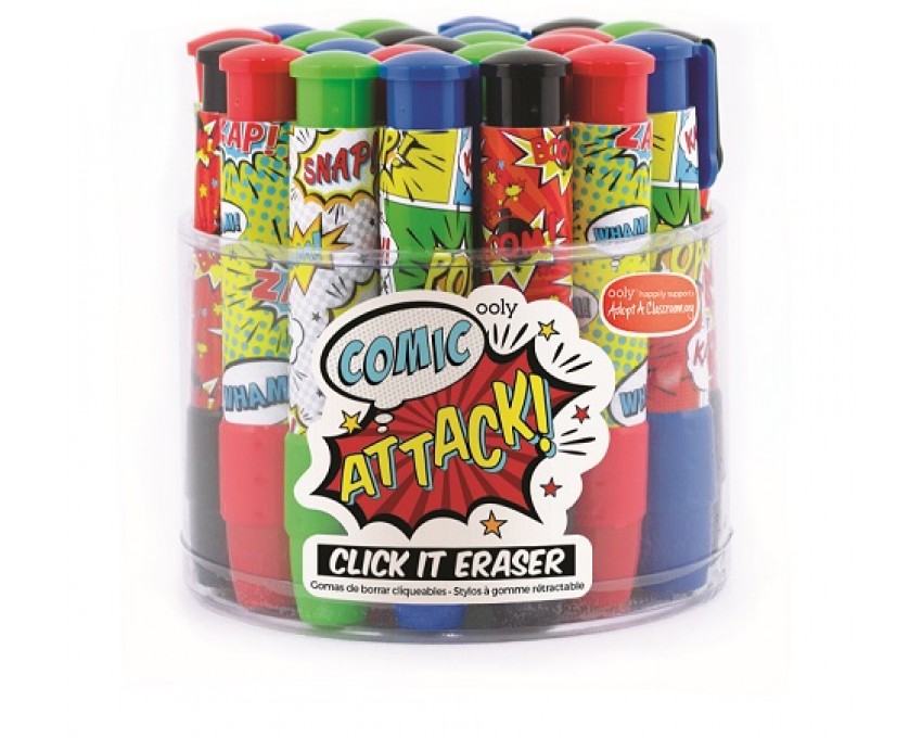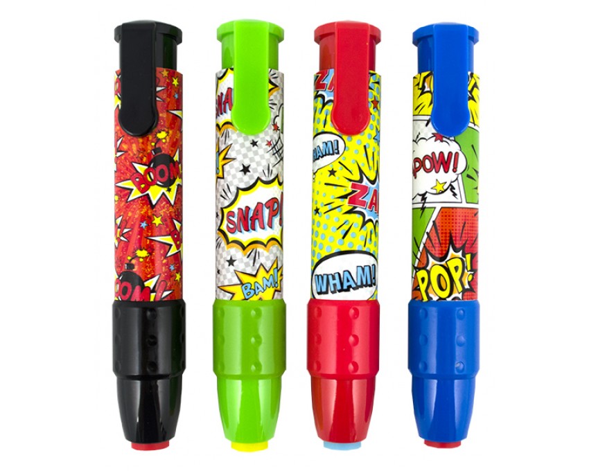 Bum! Pow!  Mechaniczne Gumki do Ścierania Komiks są jednymi z najlepszych jednorazowych gumek poniważ są super zabawne i praktyczne (zamknięte w łatwej do trzymania plastikowej oprawie). Za pomocą kilku kliknięć masz gumkę, która jest gotowa na walkę z przestępczością (ponieważ niechlujny papier jest przestępstwem).