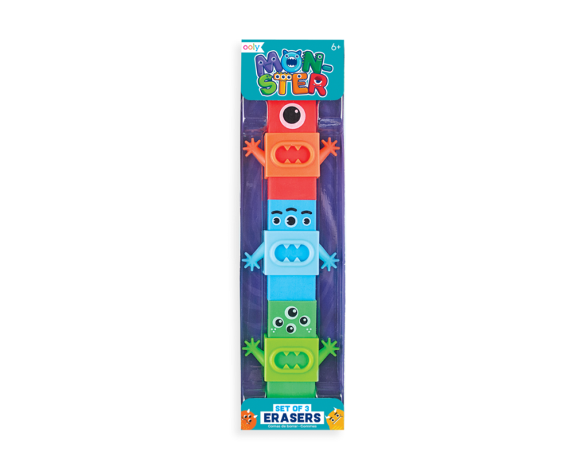 Aaaaaaaa!!! Błędy lepiej niech mają się na baczności, ponieważ potworki je dopadną! Wesoły zestaw trzech, uroczo potwornych gumek do ścierania. Gumeczki mają 3 różne kolory, buźki i zabawne paszcze i rączki. Szczęki i rączki można zmieniać między gumkami, nawet nakładać na ołówki czy długopisy.