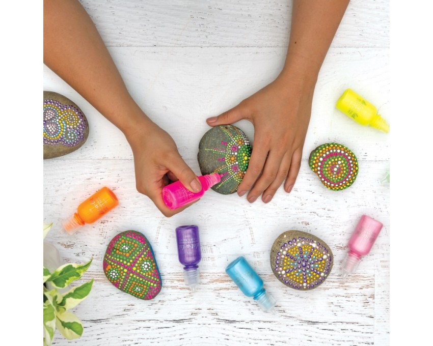 Zamień szklane butelki w dekoracyjne wazony, dodaj elegancji do płytek łazienkowych, ożyw stare doniczki, a nawet abażury i okładkę swojego pamiętnika - po prostu daj się ponieść wyobraźni. Zestaw Farb Kropkowych Dot-A-Lot zawiera 5 poręcznych butelek do wyciskania farby o wąskiej szyjce, która zapewnia dokładność i kontrolę nad kropkami, liniami i wzorami.